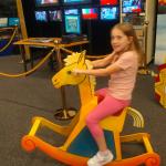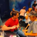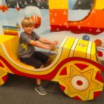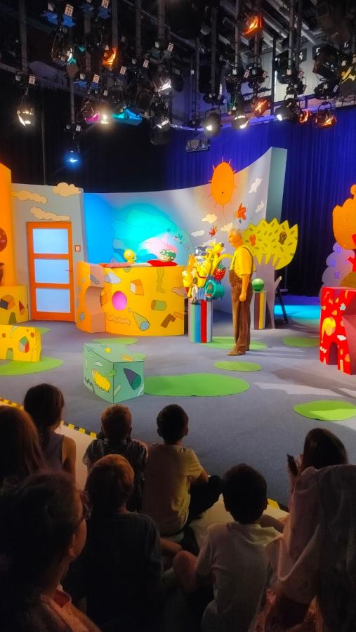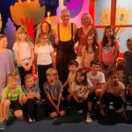 Nejprve jsme se šli podívat do velkého studia, určeného pro návštěvníky ČT, na krátký film pro děti o tom, jak to v České televizi funguje, jak se filmy natáčejí, dabují, jak se vybírají a tvoří kostýmy, a dozvěděli jsme se také, že všechny chodby v budovách ČT v Praze měří dohromady 42 km! Děti si mohly ve studiu vyzkoušet pohádkové čepice a klobouky, mohly si také zkusit „natáčet“ obrovskou filmovou kamerou, pohoupat se na koníkovi Večerníčka či se „svézt“ v jeho autíčku. Pak nás čekalo překvapení. Zrovna se natáčel poslední díl Kouzelné školky s Michalem Nesvadbou a Františkem a my mohli být přitom. Děti seděly jak myšky, nikdo nesměl ani zakašlat nebo se zasmát (což bylo chvílemi opravdu náročné). To si člověk při zhlédnutí pořadu v televizi vůbec neuvědomí, kolik práce a času to vezme, než se natočí třeba jen pouhá minuta … a to se jednalo o natáčení ve studiu, což teprve film… O přestávce se s námi Michal vyfotil a my se s ním rozloučili.