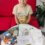 Opět si nás přebrala paní Krulichová a nastal čas předání odměny našemu hlavnímu hrdinovi – Přemečkovi Kinclovi. Od ČT edu dostal dvě krásné a zajímavé knihy, sportovní vak, blok a diplom. Ze všeho měl velkou radost a my s ním.