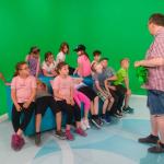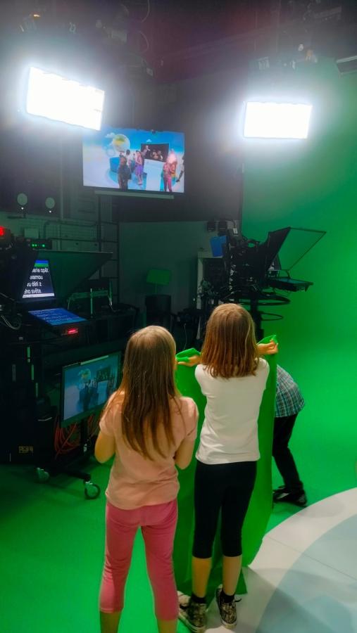 Pak už se nás ujal moderátor a dramaturg Petr Kopecký, který pracuje v redakci aktuální publicistiky a je např. i dramaturgem Zpráviček na Déčku. Provedl nás budovou zpravodajství ČT, kde se zpracovávají a vysílají zprávy České televize. Všude zde vládl silný pracovní ruch, měli jsme pocit, jako by ty zprávy a novinky prolétávaly vzduchem kolem nás. Procházeli jsme také kolem proskleného studia, kde se zrovna vysílalo. Děti ani nedutaly, jen pozorně sledovaly a poslouchaly vyprávění pana moderátora. Zavedl nás do studia, odkud se vysílají sportovní zpravodajství. Děti stály za velkým kulatým stolem a pozorovaly se na protějších obrazovkách. Tvářily se spokojeně a překvapeně, že se vidí v televizi. No a nakonec jsme šli do studia, kde se vysílají Zprávičky Déčka, a také např. Otázky Václava Moravce. Celé studio je vymalované zelenou barvou a je „kouzelné“. Děti dostaly od pana moderátora zelené pruhy látky a „ejhle“, na protější kameře mi moji žáčci mizeli před očima! Tady jsme si opravdu užili legraci! Přišel však čas natáčení Zpráviček, a tak jsme studio uvolnili Jakubu Voříškovi a šli se na něho dívat na obrazovku v chodbě za dveřmi. Také on musel několikrát natáčet pořad od začátku nebo od posledního sestřihu, prostě žádná brnkačka to nebyla. Hotové úterní zprávičky jsme pak viděli celé jako první ještě před večerním vysíláním. Kuba přišel za námi a každému z dětí daroval svoji fotku i s věnováním. Na závěr se s námi ještě vyfotil.