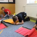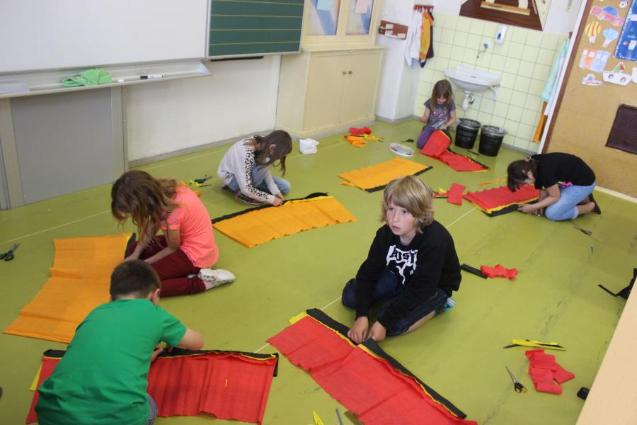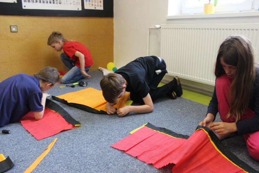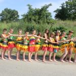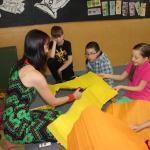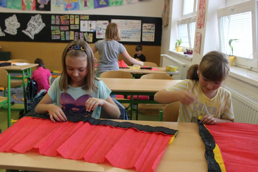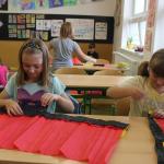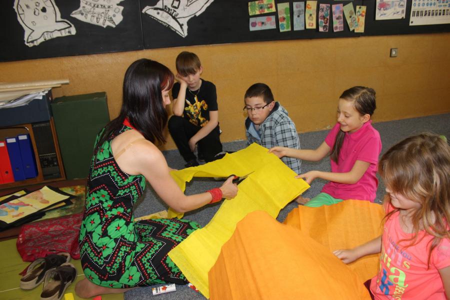 Velkou inspirací nám byl jihoafrický tanec Venda Domba Dance. A co to je vlastně za tanec? Nejznámější z tanců kultury Venda je Domba neboli tanec krajty. Tančí ho mladá neprovdaná děvčata jako slavnostní přijetí ženství. Jsou postavené v dlouhém řetězu těsně za sebou držíce se za lokty, jejich ruce plynule tančí a vlní se jako „had“. Nás nejvíc zaujal jak tanec samotný, tak tradiční oděv tanečnic, malá barevná zástěrka s korálky a ornamenty zvanými „thahu“. Během několika hodin výtvarné výchovy si ji děti ušily z krepového papíru i s náhrdelníky a horními díly. Nejenže si děti vytvořily nádherné kostýmy, ale také se z pracovních listů dozvěděly hodně základních informací a zajímavostí o Africe. Podle otázek vyhledávaly ve skupinkách vše potřebné na internetu.