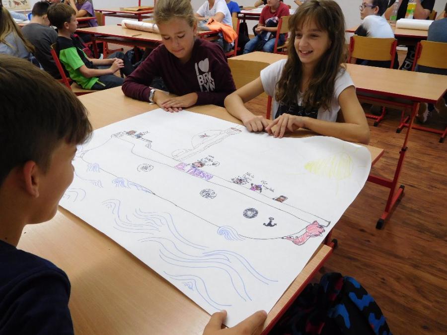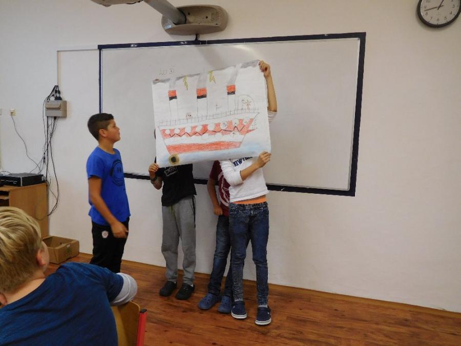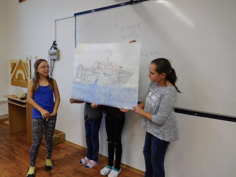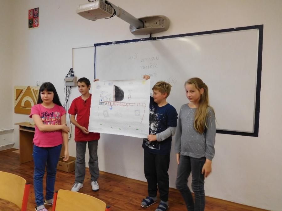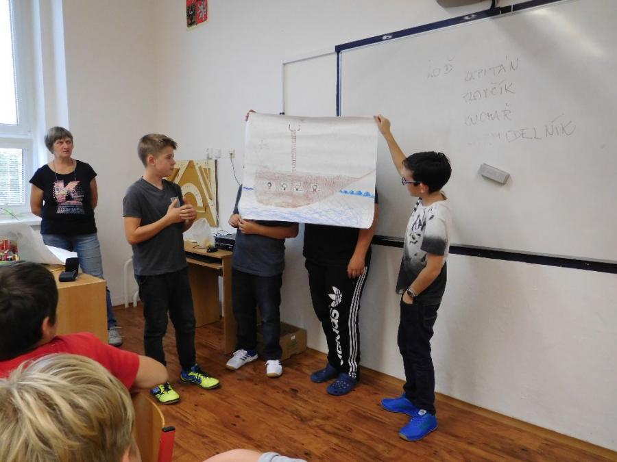Z důvodu nepřízně počasí všechny aktivity probíhaly ve škole ve třídě a v malé tělocvičně. V první části si žáci zahráli několik seznamovacích her, druhá část byla ve znamení práce ve skupinách. Žáci dostali za úkol namalovat loď a na ni namalovat sami sebe v pozici kapitán, kormidelník, plavčík nebo kuchař. Na tento úkol měli vymezenou jednu vyučovací hodinu. Po uplynutí této doby každá skupina musela svoji loď představit a popsat. Zajímavé bylo to, že u některých skupin si žáci role určili sami, jinde demokraticky losovali. V jednom případě byl kapitánem ten, kdo prohrál v losování.