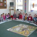 Ten, kdo sleduje naší družinu tak ví, že cestujeme vláčkem po neprobádaných oblastech anglického jazyka. Náš vláček již procestoval a zastavil v několika stanicích jako je např. „Barvíčkov, Ovocná Lhota, Číslov, Tvarová Lhota, Příšerkov“. Děti pilně sbírají vagonky a razítka do svých vystavených pasů. A společně připojujeme jednotlivé vagonky k našemu velkému vláčku. K tomu, aby dostali razítko a mohli se zapsat do „vagonku“ musí splnit určitá kriteria pro postup do další stanice. Jedná se o jednoduché úkoly. Naposledy jsme se připravovali na Jarní zastávku s básničkami o jaru a Velikonocích. Děti si vyzkoušely některé anglické hry.