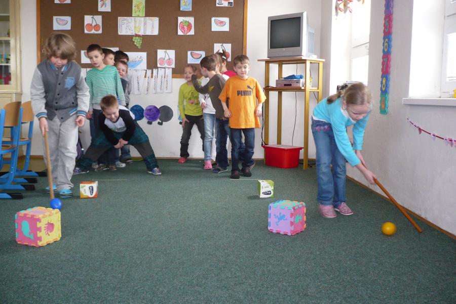 Konečně jsme se dočkali i krásného počasí a můžeme vyrazit ven, kde hrajeme společně hry pro rozvoj pohybových schopností a dovedností s využitím krátkých anglických příkazů, které si děti velmi rychle zapamatují a používají. Děti se při hře velmi rychle učí používat jazyk bez ostychu.