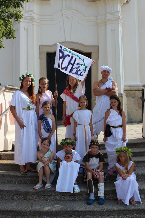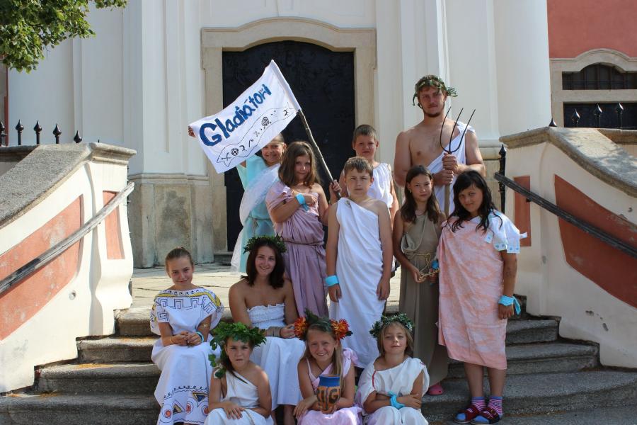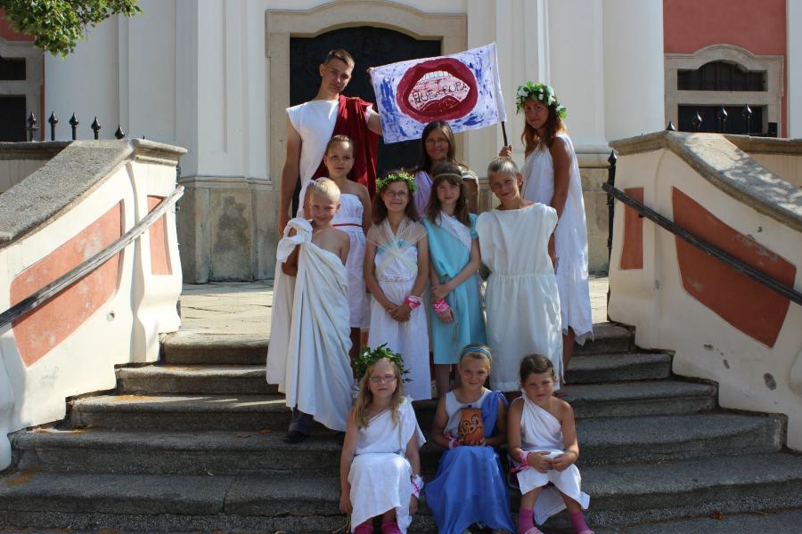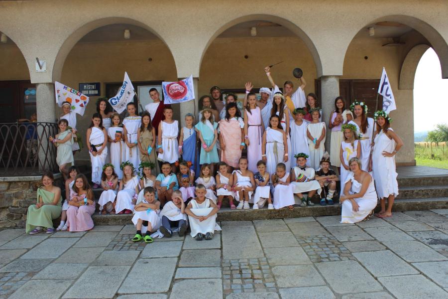 Největší odměnou pro nás vedoucí byly večerní nástupy v kostýmech, kdy každé dítě mělo svůj vlastní krásný řecký šat, nad hlavami jim vlály vlajky a v rukou držely své týmové amfory, které si samy nazdobily. Tak i druhý turnus se vydařil a příští rok zase na dva!