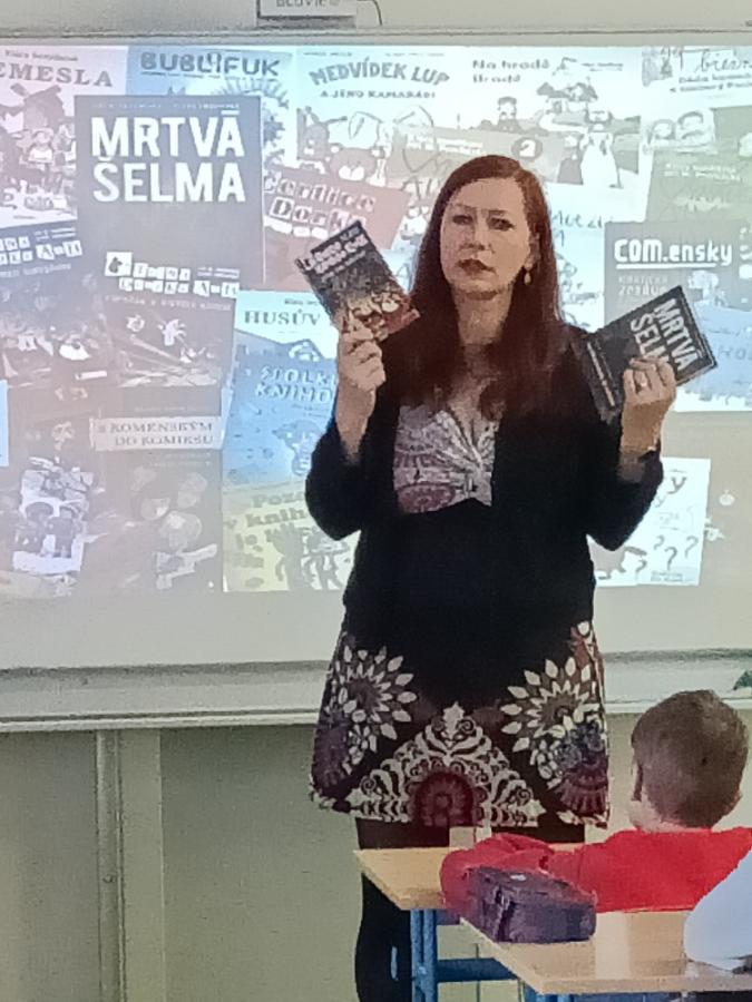 Paní spisovatelka nám ukázala také hodně knížek a provedla nás jednou z nich, která se jmenovala “SPOLKLA MĚ KNIHOVNA.”