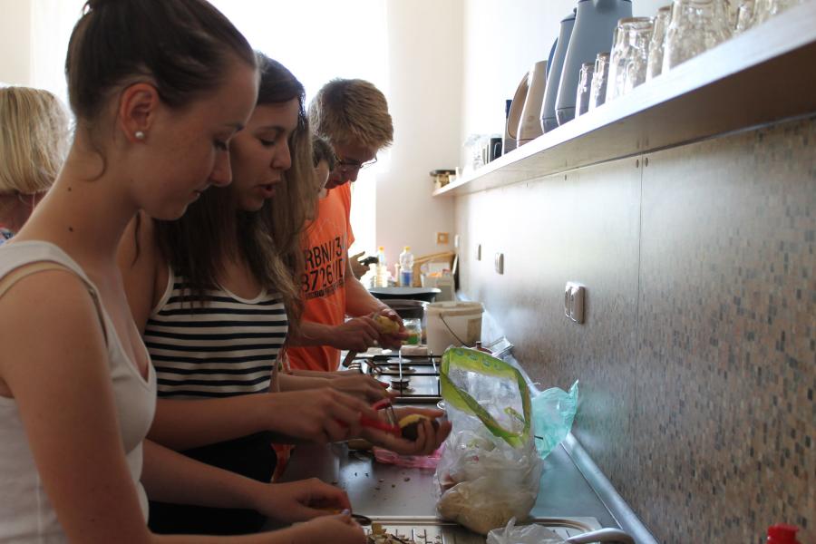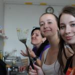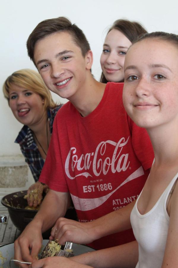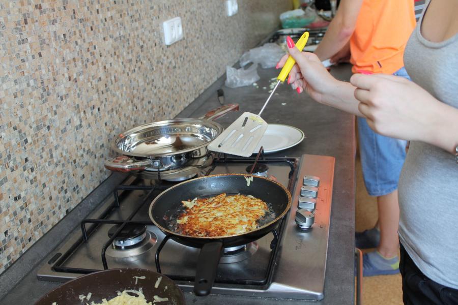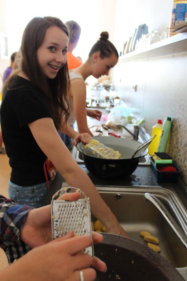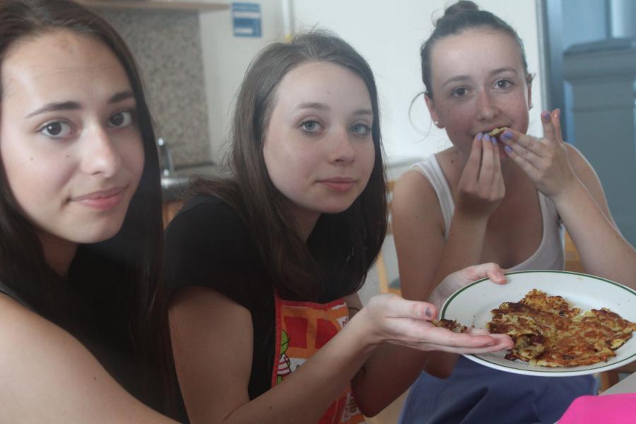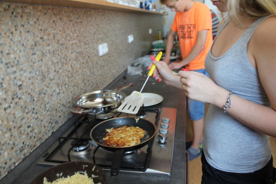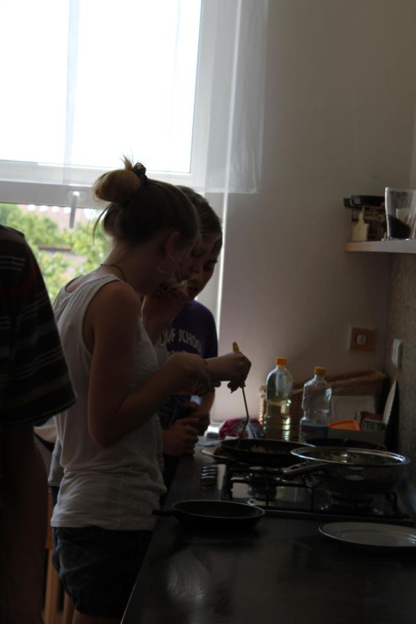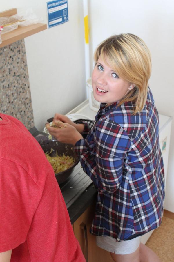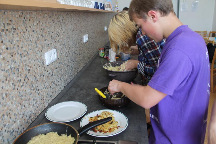Ve středu 3.6. byl výjimečný den, protože jsme se rozhodli udělat výborné bramborové placky (bramboráky). Ale nápad vznikl vlastně už v úterý, protože jsme zrovna četli jeden článek z učebnice německého jazyka. A jen tak náhodou to byl článek o tom, jak se dělají bramboráky. Byl celkem podrobně popsaný, tak stačilo jen tento článek přeložit a měli jsme skvělý recept před sebou. Sice nás v článku zarazila doposud neznámá slovesa, ale s jejich poznáním se celý text najednou překládal lépe. Ve středu to celé vypuklo. Předposlední hodinu jsme šli do školní kuchyňky. Každý přinesl ingredience podle toho, jak nám bramboráky chutnají. Někdo je měl se šunkou, někdo se salámem a někdo samotné. Každou věc, co jsme dělali a brali do ruky, jsme pojmenovávali německy. Paní učitelka Fišerová nás u toho opravovala a u toho opravování se velice smála. Nastrouhali jsme hromadu brambor a postupně přidávali rozmačkaný česnek, majoránku, a sůl. Tohle celé nám zabralo celou jednu hodinu. Potom už na nás čekalo jen smažení, které šlo cítit snad na celé škole. Aby nikdo neřekl, že jsme lakomí, tak jsme připravili těsto i pro učitele a druhou skupinu naší třídy. Bramboráky jsme jedli rovnou z pánvičky. Byla to suprová hodina a rádi bychom si to zopakovali.