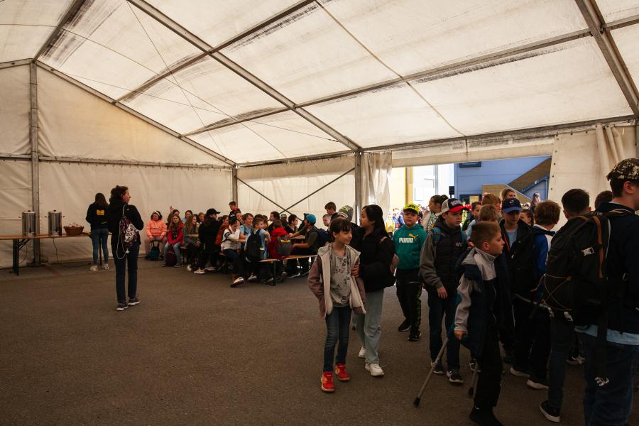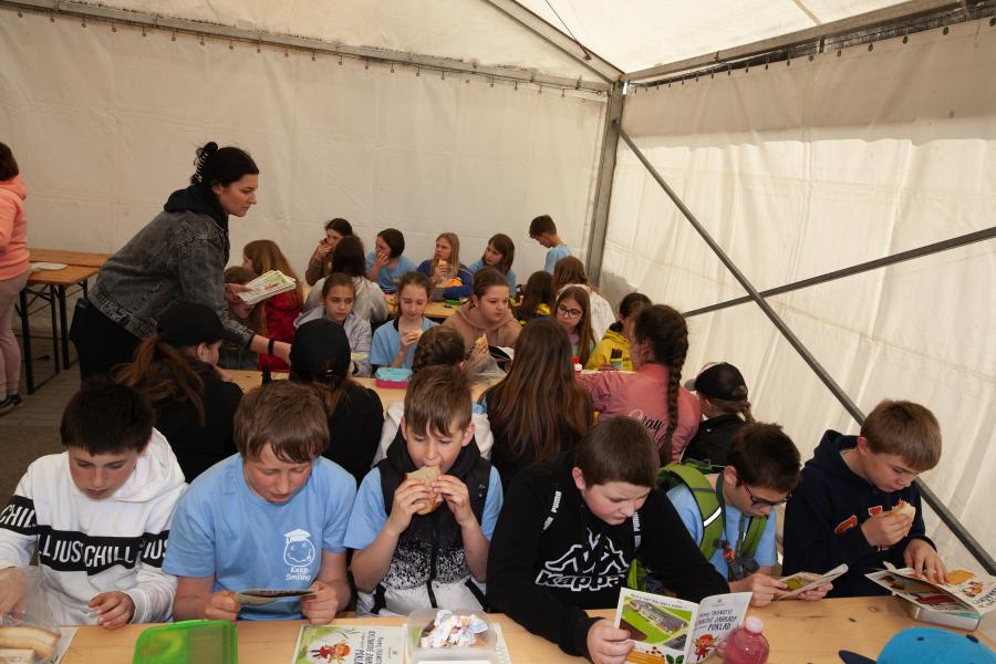 Abychom trochu nahlédli na to, jak ekologicky, v biokvalitě, v kontaktu s pěstiteli, s radostí a láskou jde vše realizovat, využili jsme nabídku jejich exkurzí. Měli jsme štěstí, že od dubna 2023 je otevřena nová budova s názvem Solis a v ní nový návštěvnický okruh – exkurzní trasa nabitá informacemi a zajímavými pohledy i průhledy do zpracování bylin, výroby i skladů. Mohli jsme ocenit i architektonicky unikátní prostor a nespočet originálních nápadů, jak je interiér doplněn – například světla a celý strop pokrytý papírovými pytli od bylin, ze stropu visící čajové sáčky, které instalovalo 50 zaměstnanců přibližně 14 dní, byliny otisklé ve zdi,… Součástí exkurze bylo také plno informací získaných netradiční formou – „živé“ leporelo vývoje rostliny, zajímavosti o jednotlivých bylinkách na obrovských pytlích s bylinami, mapa se spolupracujícími pěstiteli, jejich fotografie a plno dalšího. Děti ve skupinách prošly s průvodkyní celou budovou, pátrací hrou hledaly poklad, namíchaly si vlastní sypaný čaj, nakupovaly v obchůdku a mohly si pochutnat na dobrotách a zmrzlině v místní kavárně.