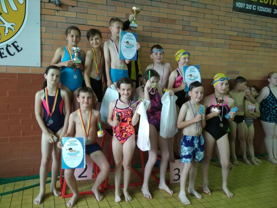 V úterý 15. května se Nikol Mikulicová, Karolína Procingerová, Benedikt Bláha a Václav Padrta zúčastnili plaveckých závodů třetích tříd v Hustopečích. Závodilo 27 škol, z toho 58 chlapců a 53 dívek. Ve všech disciplínách naši žáci získali medaile. Vašík byl nejlepší z chlapců, Nikolka z dívek a ve štafetě, kterou plavali všichni čtyři, byli na druhém místě. Kromě plaveckých soutěží byly pro závodníky připravené i různé vodní hry, při kterých se odreagovali a zrelaxovali. Domů si odvezli diplomy, medaile a poháry, které si jako vynikající plavci opravdu zasloužili.