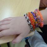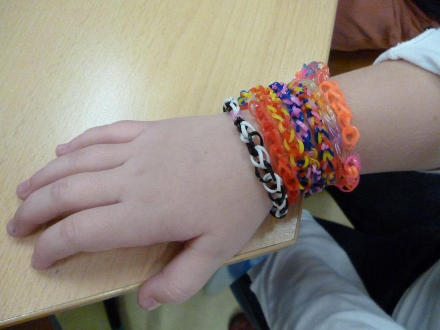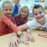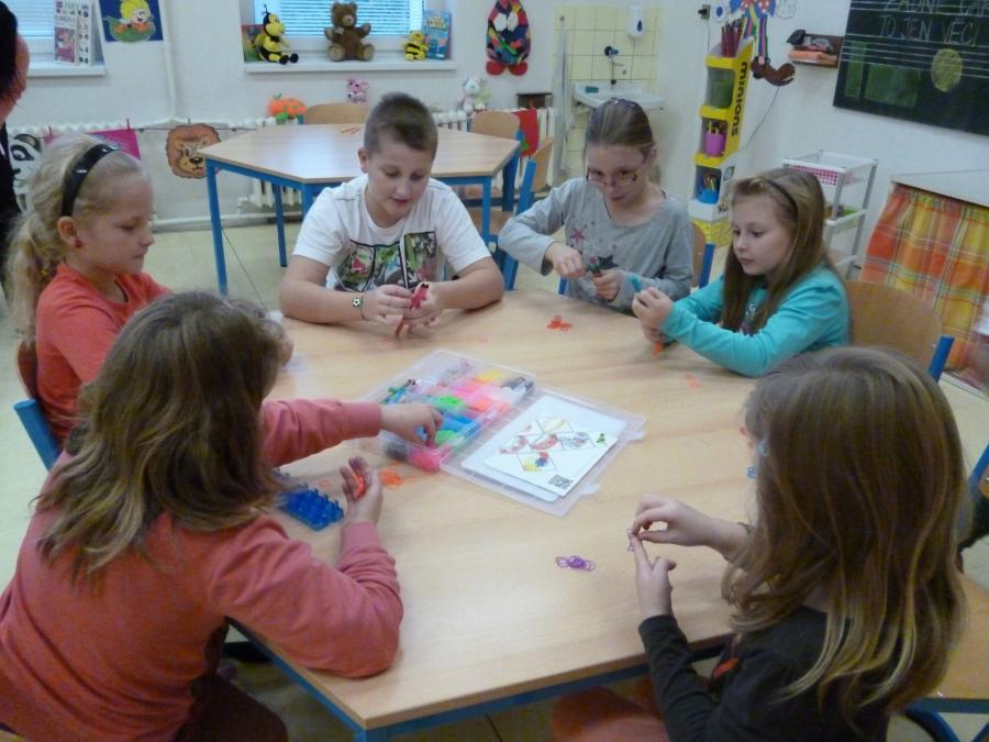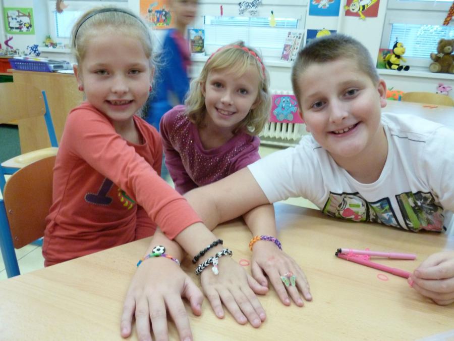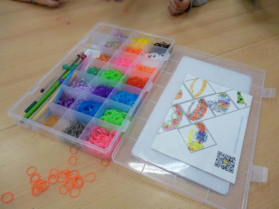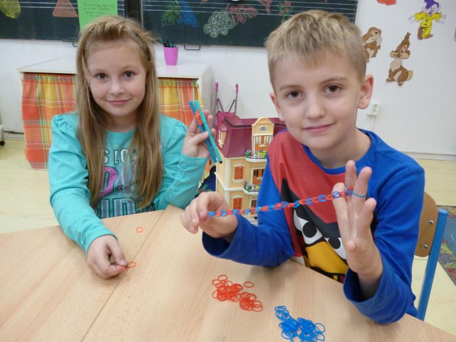a kreativní vyrábění. Děvčata z naší družinky se nyní velmi ráda baví tzv. gumičkováním. Z drobných barevných gumiček splétají zajímavé a pěkné náramky nebo přívěsky