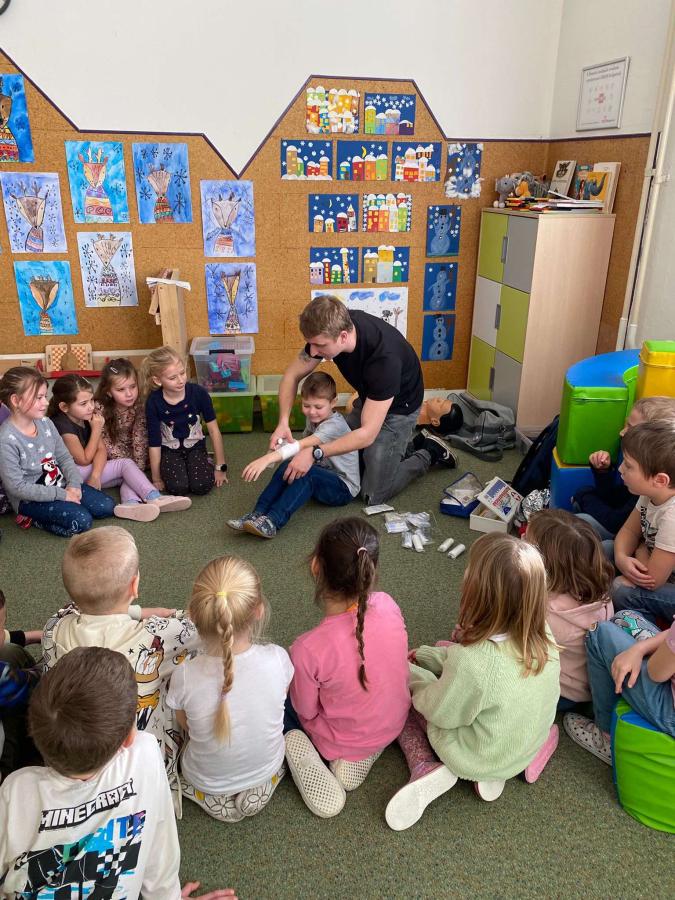 Během besedy si děti mohly vyzkoušet praktické dovednosti, jako je nácvik hovoru s operátorem záchranné zdravotní služby. Učily se také, jak správně ošetřit drobná poranění, například odřeniny, zastavit krvácení nebo postupovat při zlomenině.