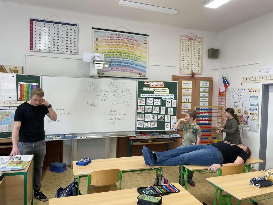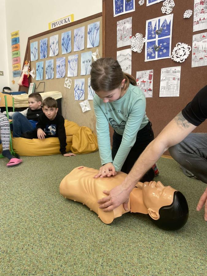 Pan hasič však nepřišel sám – přivedl s sebou „Andulu“, figurínu určenou pro nácvik masáže srdce. Každý žák měl možnost si vyzkoušet, jak taková masáž probíhá, a získal tak cenné zkušenosti, které mohou v budoucnu pomoci zachránit život.