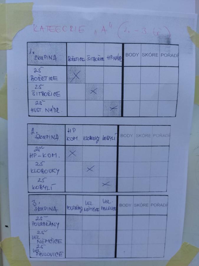 Na finále okresního kola do Břeclavi, které se hrálo 4. května, odcestovali pouze žáci mladší kategorie. Po dvou nadějných výsledcích ve skupině, kdy naši žáci porazili ZŠ Tvrdonice 3:2 a remizovali se ZŠ Mikulov 2:2 jsme postoupili do semifinále. V semifinále jsme narazili na ZŠ Břeclav a po nerozhodném výsledku 2:2 naši žáci bohužel nezvládli penaltový rozstřel a v následném utkání o třetí místo jsme prohráli se ZŠ Lednice.