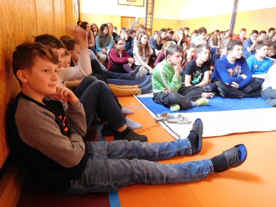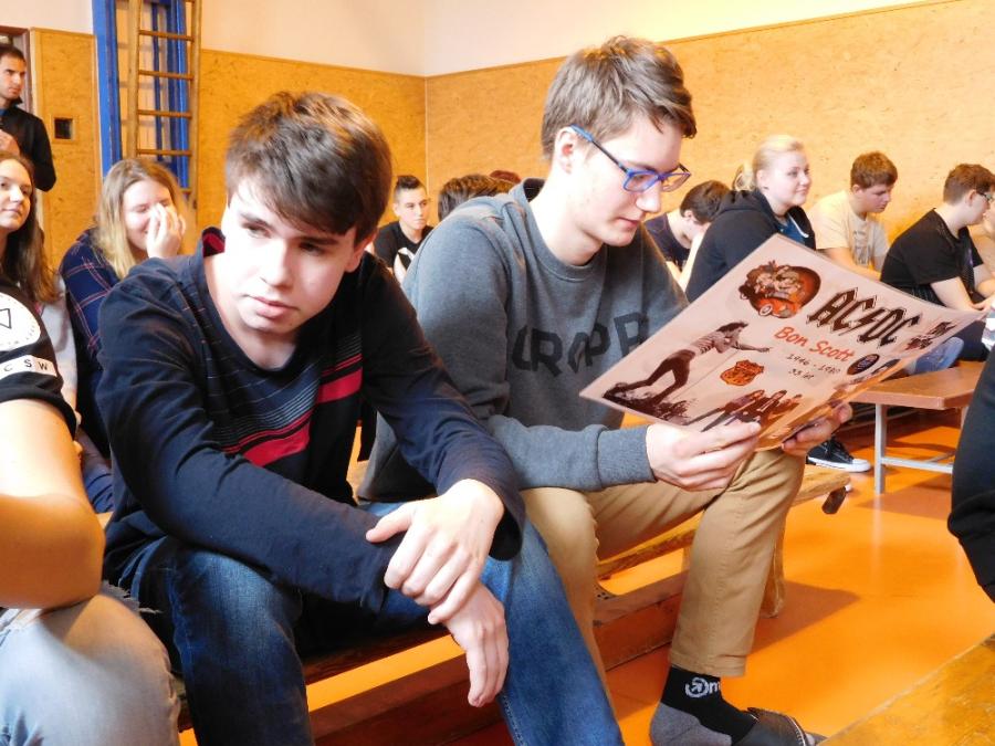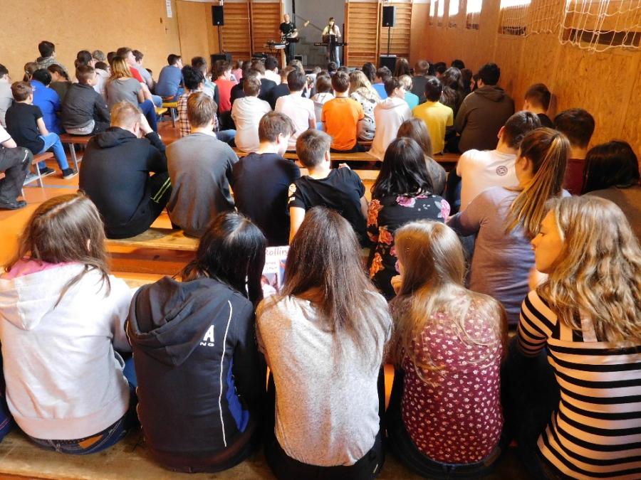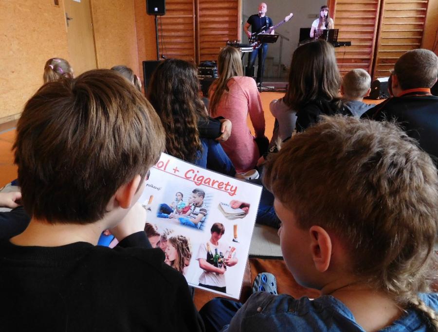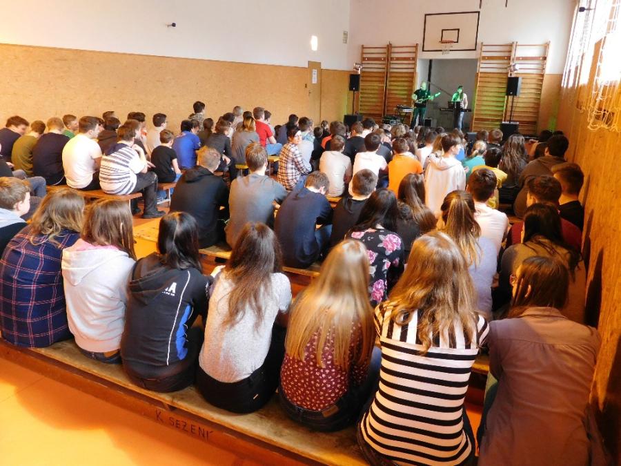 V pátek 24. 3. 2017 naši školu navštívila dvojice hudebníků, kteří k nám přijeli z Prostějova s programem S hudbou proti drogám. Nebezpečností těchto návykových látek nás provedla dvojice talentovaných, hudebně nadaných lidí – paní Markéta Doležalová, která nás uchvátila svým příjemným hlasem, a pan Jiří Klemsa, jehož talent, který spočívá ve hře na kytaru, nás všechny, jak se lidově říká „posadil na zadek“. Tito úžasní lidé jsou si moc dobře vědomi, že přednášek, které svým charakterem připomínají spíše vyučovací hodinu, jsme navštívili už spoustu, ale vlastně v nás toho moc nezanechaly. Proto spolu s sebou přinesli novou, zábavnější formu, díky které jsme se dozvěděli vše důležité, ale přitom informací bylo takové množství, aby nás neunudilo k smrti.