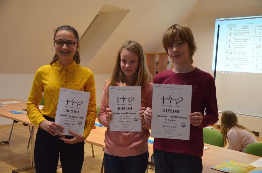 V měsíci listopadu proběhlo na naší ZŠ školní kolo soutěže Bible a my. V I. kategorii (I.stupeň) se s biblickými otázkami na téma „Apoštolové, jak je známe z evangelií“ potýkali D. Dobrucký, T. Krupicová, M. Hádlík a P. Šlancar. Ve II. kategorii (6., 7.roč.) test školního kola na téma „Josef Egyptský“ psali M. Bílek, K. Pleskač a V. Macková. Za pomoc děkuji panu faráři M. Slatinskému.