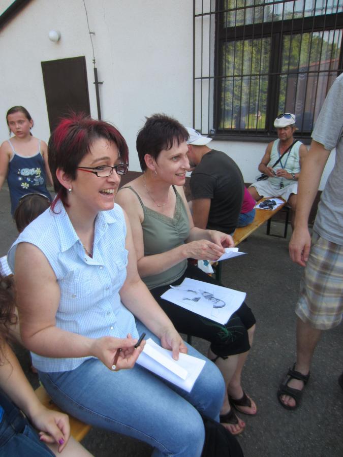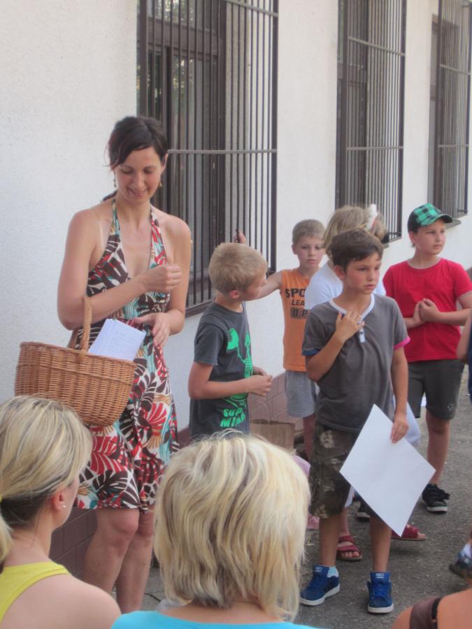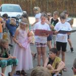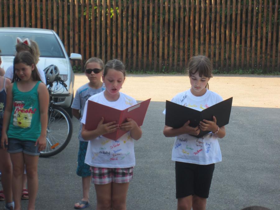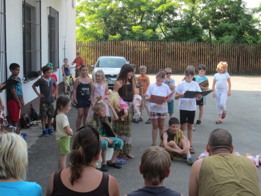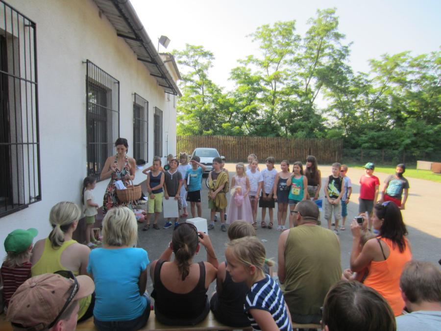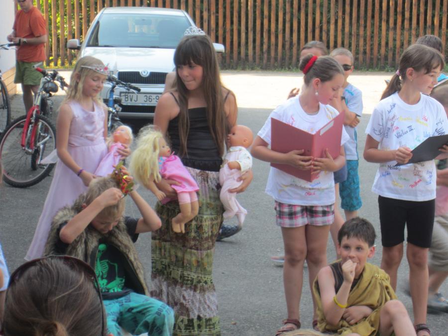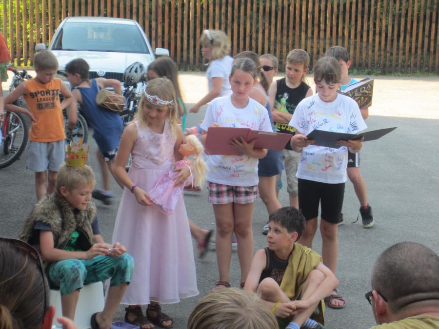 Už dlouho jsme si plánovali táborák dětí a jejich rodičů, který jsme nakonec uspořádali 20. června ve Velkých Pavlovicích u myslivny. Žáci si pro rodiče v pracovních činnostech vyrobili pozvánky s programem, kde jedním z bodů bylo divadlo. Ve vlastivědě se totiž nadchli učivem o Václavu II. a Václavu III., proto jsme společně zpracovali do scénáře právě toto téma. Děti hru obohatily především o vtipné momenty, vytvořili si a přinesli vlastní rekvizity, rozdělili role a pečlivě a s nadšením zkoušeli hrát. Jako premiéru představení zahráli prvňákům a druhákům. Nyní jsme byli výborně připraveni!