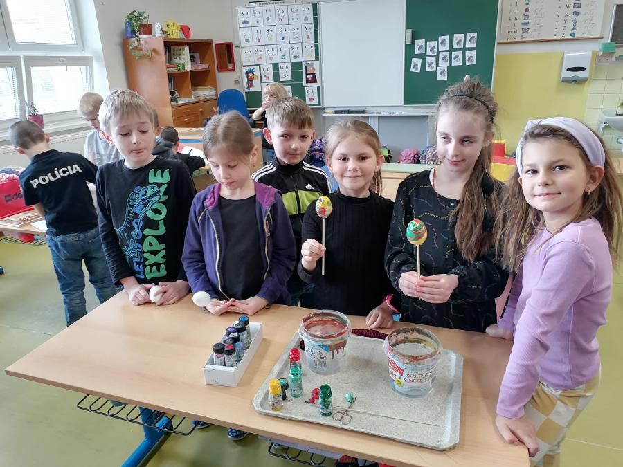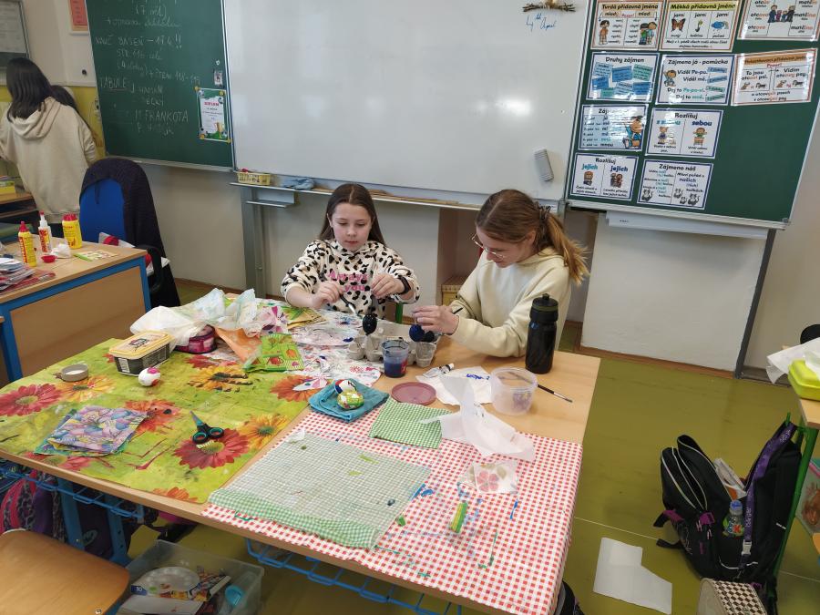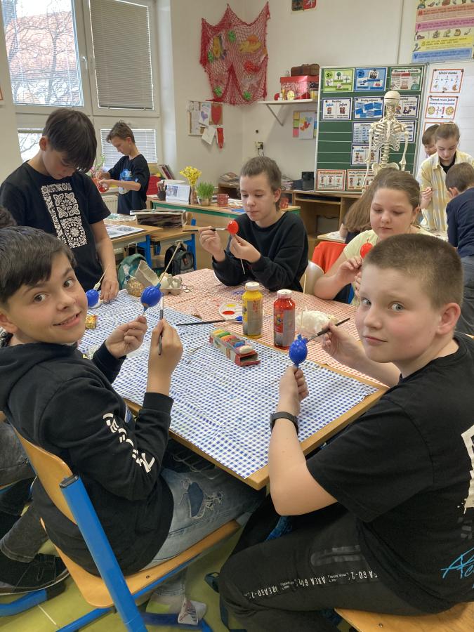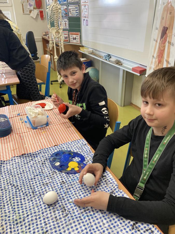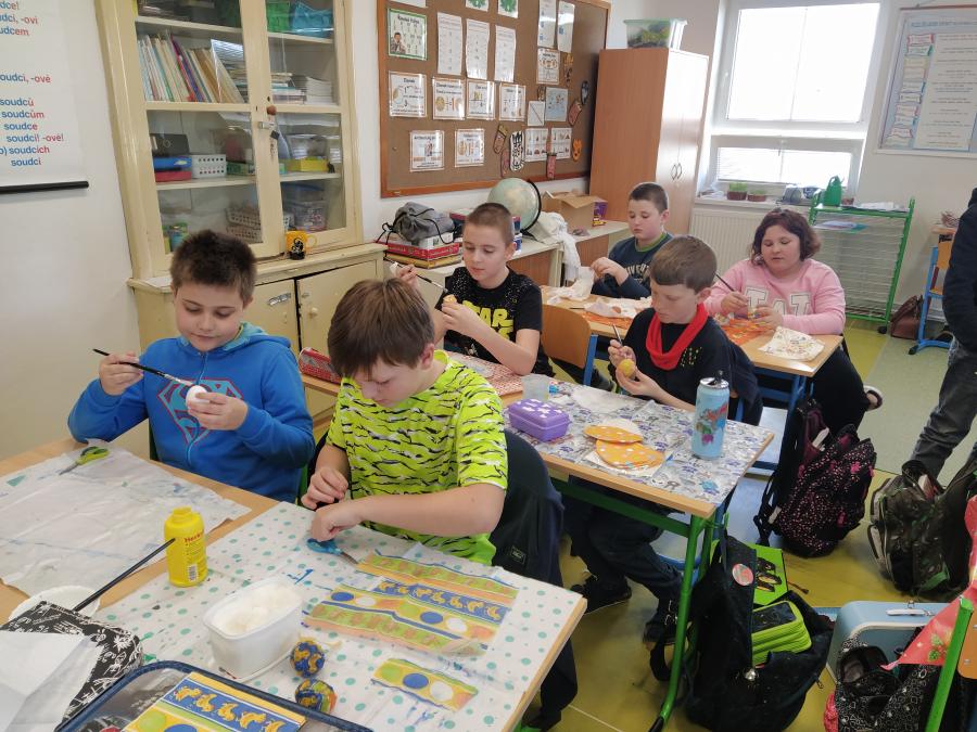Vyučující s paními vychovatelkami pro naše školáky připravili v dílničkách mnoho různých aktivit a činností. Žáci si mohli vybrat z pestré nabídky. Nejoblíbenější z velikonočních aktivit bylo barvení kraslic. Děti vytvářely různé motivy a vzory pomocí vosku, látky, provázku, mramorování, ovesných vloček i ubrousků. Kraslice zdobily tradičními motivy, ale především se inspirovaly jarními květinami a zvířaty.