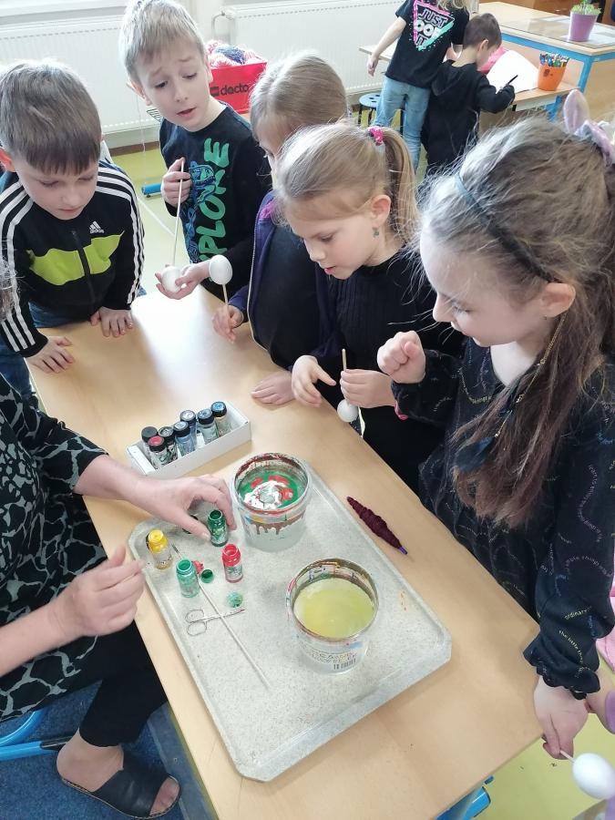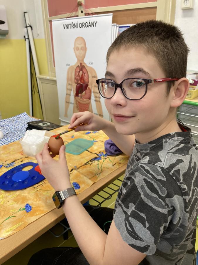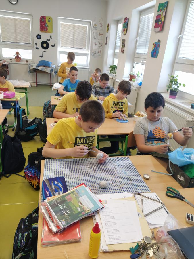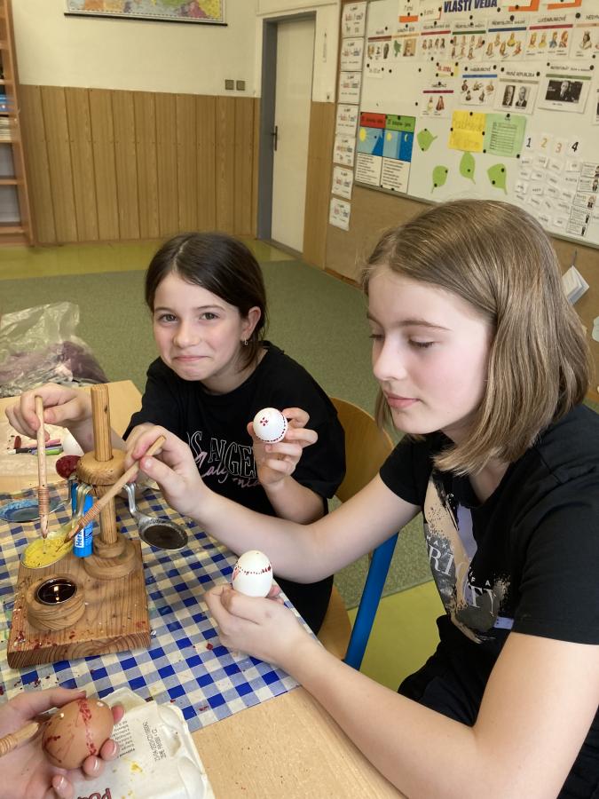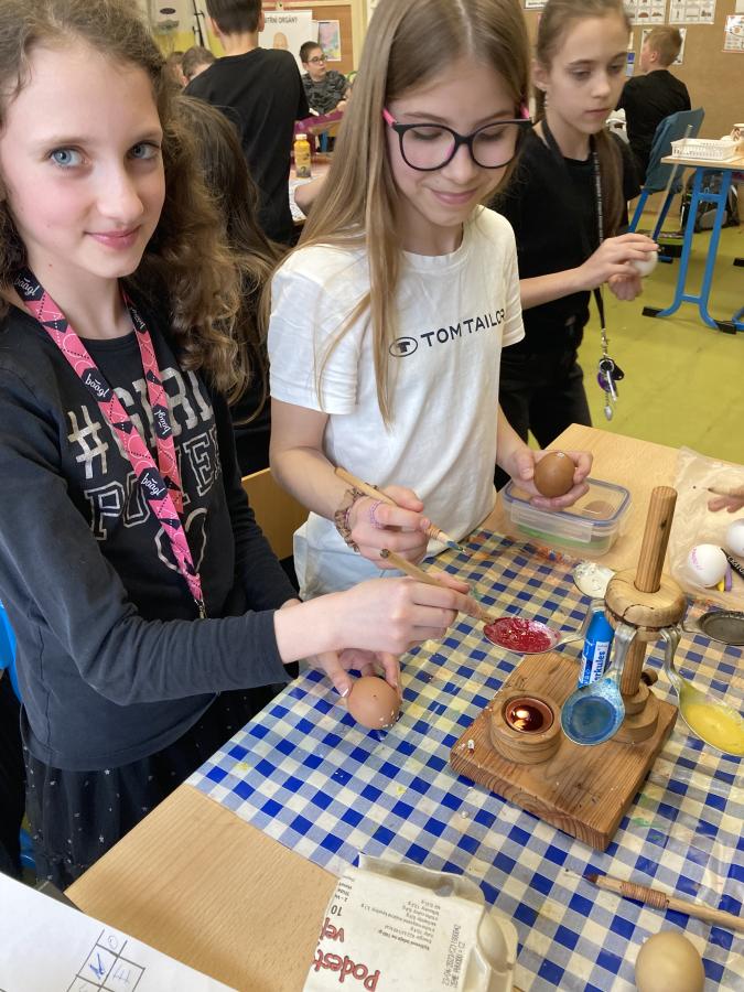 Vyučující s paními vychovatelkami pro naše školáky připravili v dílničkách mnoho různých aktivit a činností. Žáci si mohli vybrat z pestré nabídky. Nejoblíbenější z velikonočních aktivit bylo barvení kraslic. Děti vytvářely různé motivy a vzory pomocí vosku, látky, provázku, mramorování, ovesných vloček i ubrousků. Kraslice zdobily tradičními motivy, ale především se inspirovaly jarními květinami a zvířaty.