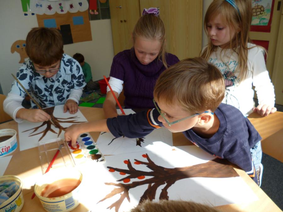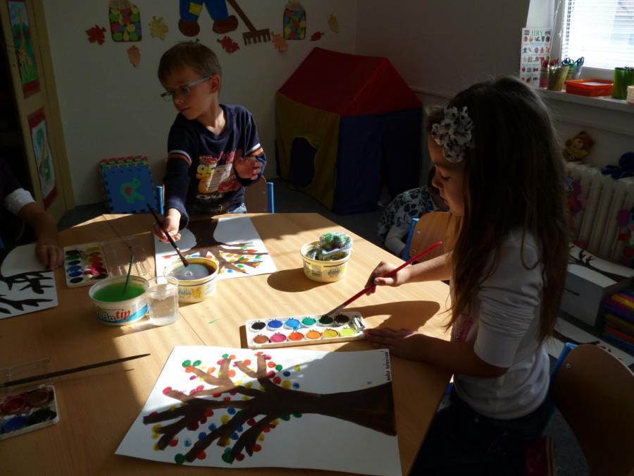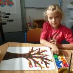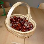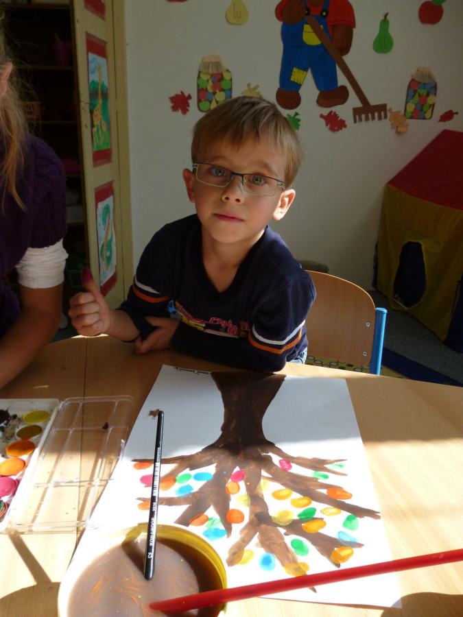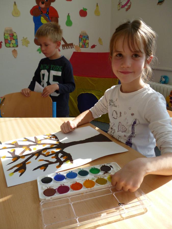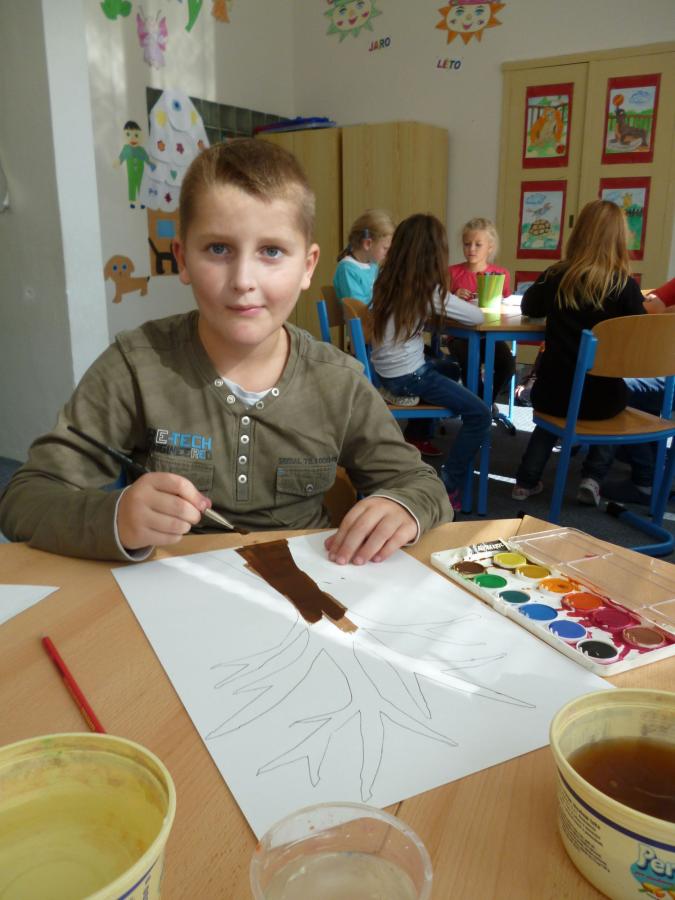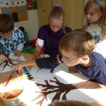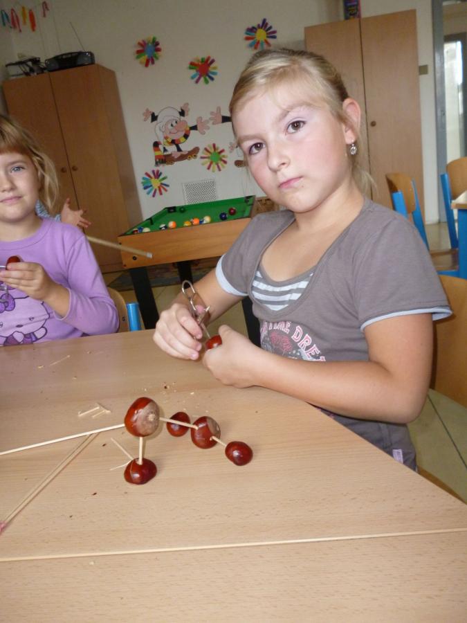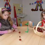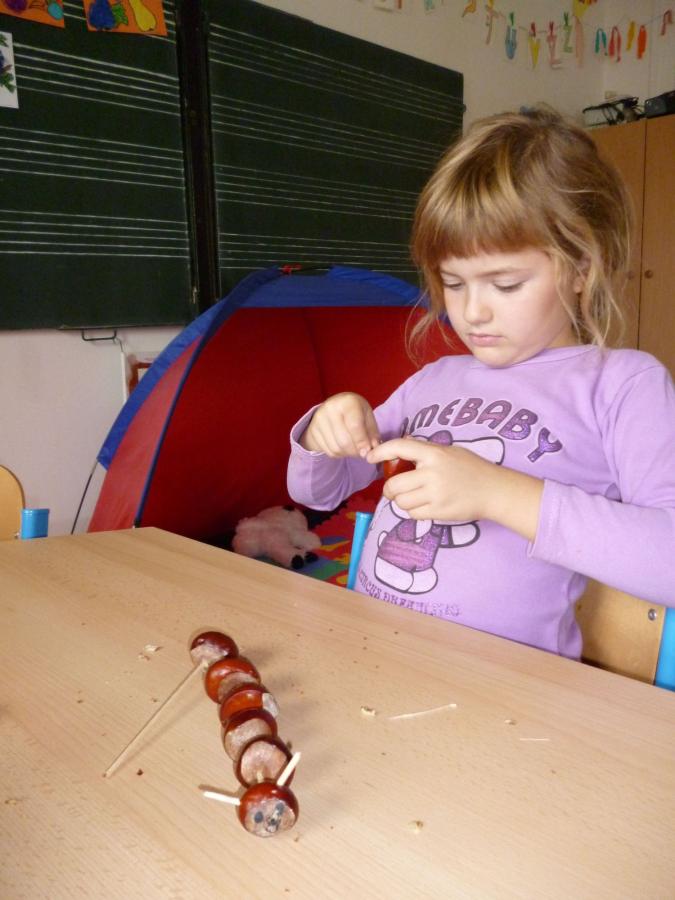 Četba s motivy podzimního času nás inspirovala k výrobě drobných postaviček z kaštanů a malbě pestrého podzimního stromu.