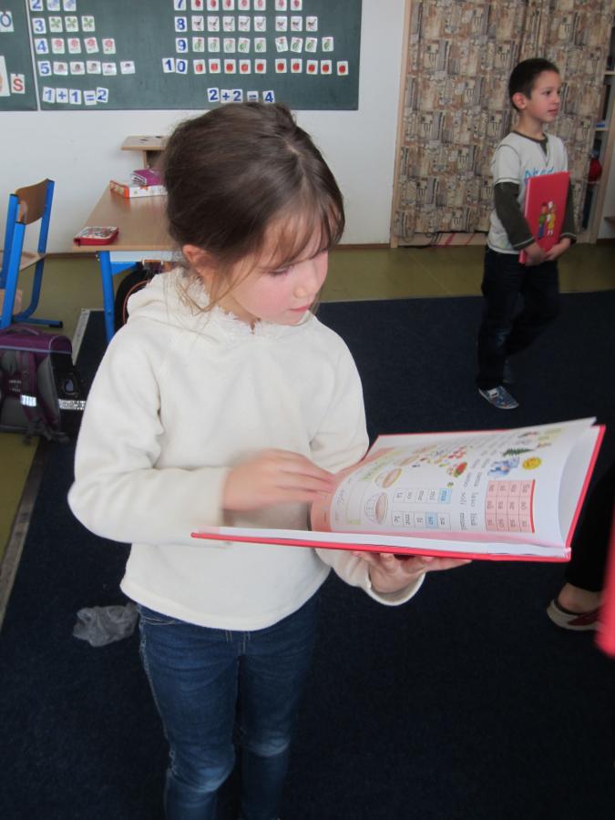 Školáčci z 1.A slavili, dostali od pana ředitele SLABIKÁŘ