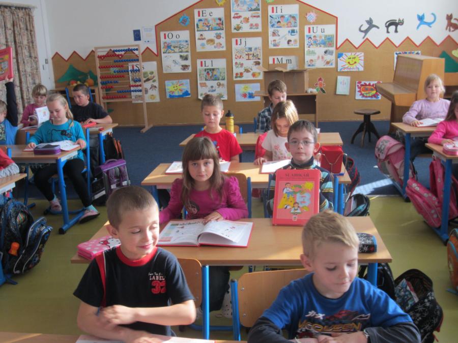 Školáčci z 1.A slavili, dostali od pana ředitele SLABIKÁŘ